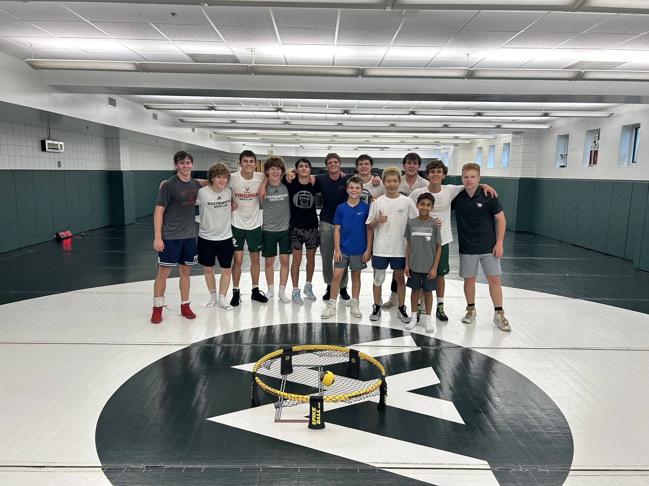 At the middle school level, we prioritize fun followed by learning the basic movements and pressures involved in wrestling and most every sport. Games like Spikeball abound to promote hand-eye coordination and agility, and mini-games break up wrestling instruction throughout.